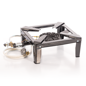 Starkbrenner auf Gestell, mit Luftregulierung und Regulier-Regulierhahn zusätzlich mit Zündsicherung. Abmessung 380x380 mm mit 2 Meter Propanschlauch, Niederdruckregler, komplett.
